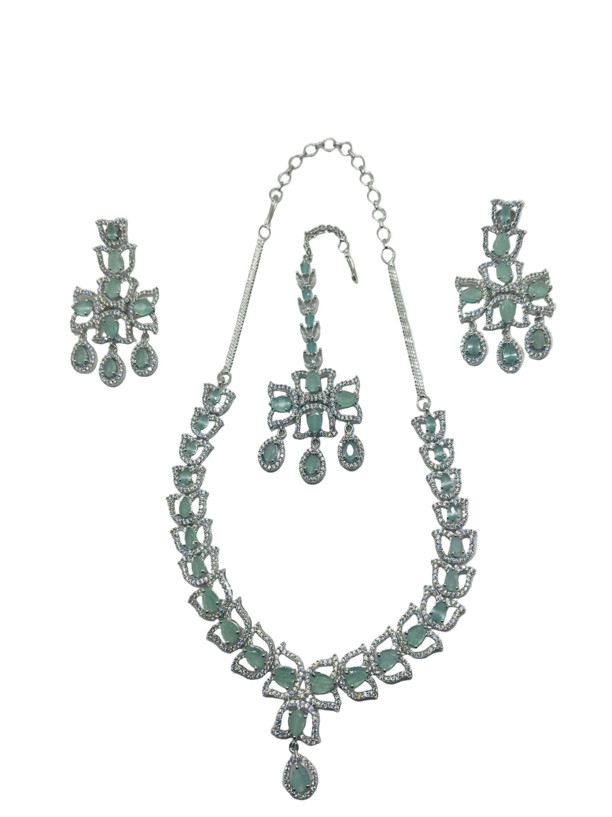 We are introducing our exquisite American Diamond Necklace with maang tikka, perfect for any occasion. The delicate pastel green stones add a touch of beauty, while the maang tikka completes the look. Enjoy the perfect blend of elegance and versatility with this stunning piece.