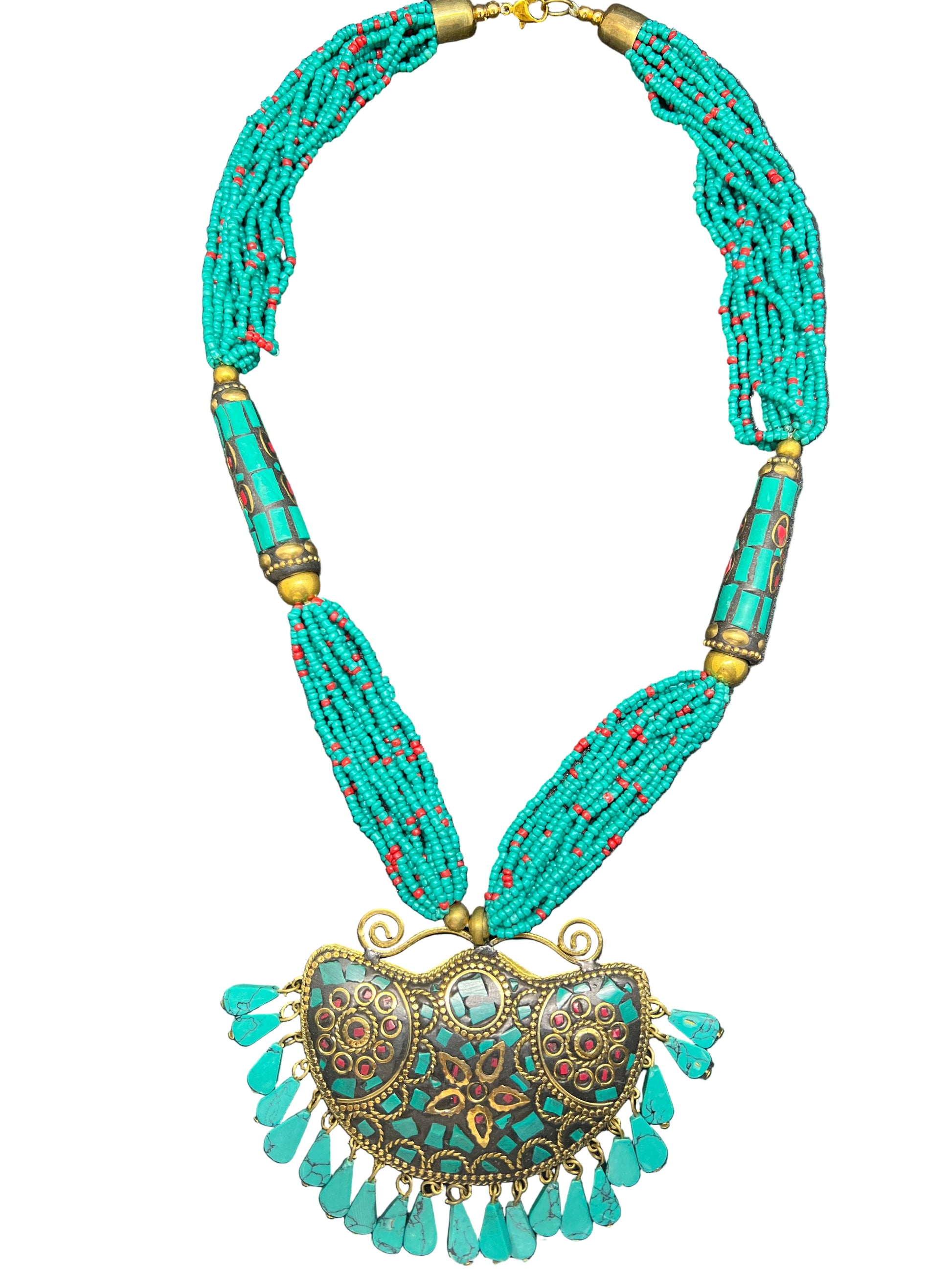This elegant Beads Necklace features a stunning combination of green beads and intricate antique flower design. The modern yet classic design is perfect for adding a touch of sophistication to any outfit.