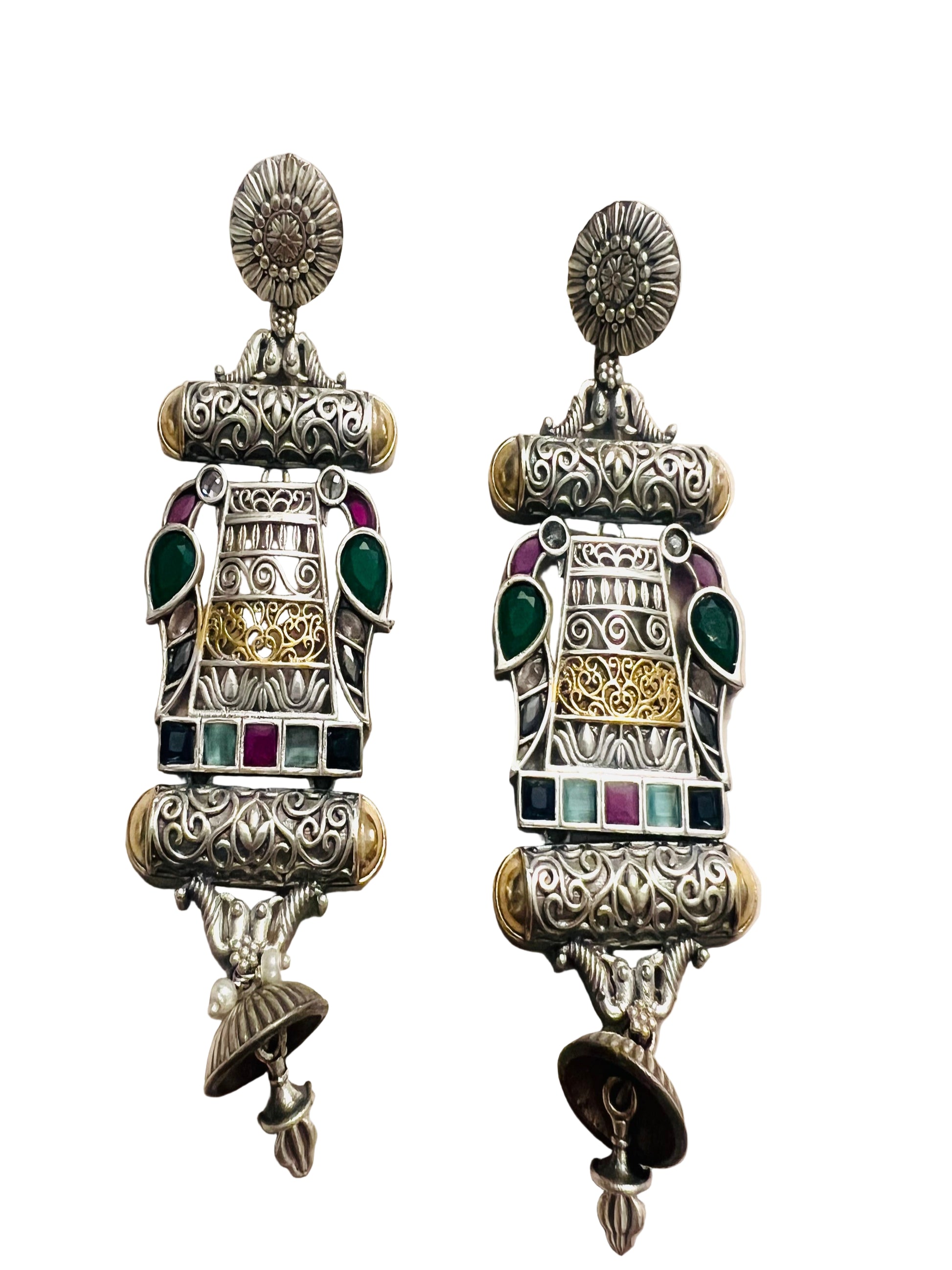 Enhance your festive look with our dual-tone earrings, featuring multi-color stones for a unique and eye-catching design. These one-of-a-kind earrings add a touch of elegance and sparkle to any outfit. Perfect for any special occasion, these earrings are bound to make you stand out and feel confident!