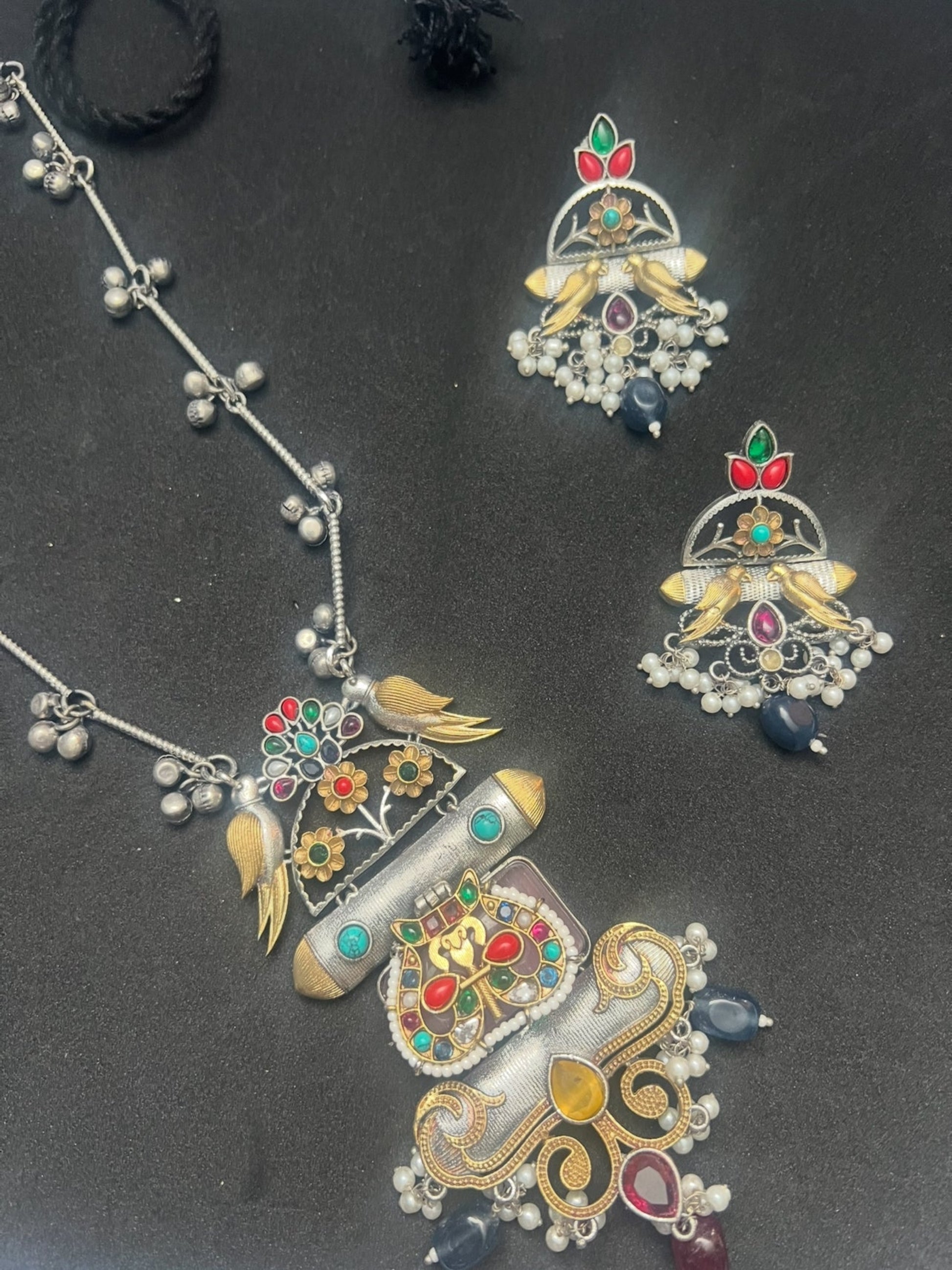 Elevate your elegance with this dual tone long necklace featuring intricate bird motifs accented by ghungroos on both sides. Adorned with vibrant multi-color stones, it beautifully blends traditional craftsmanship with a contemporary, trendy appeal. Perfect for adding a unique, sophisticated touch to any ensemble.