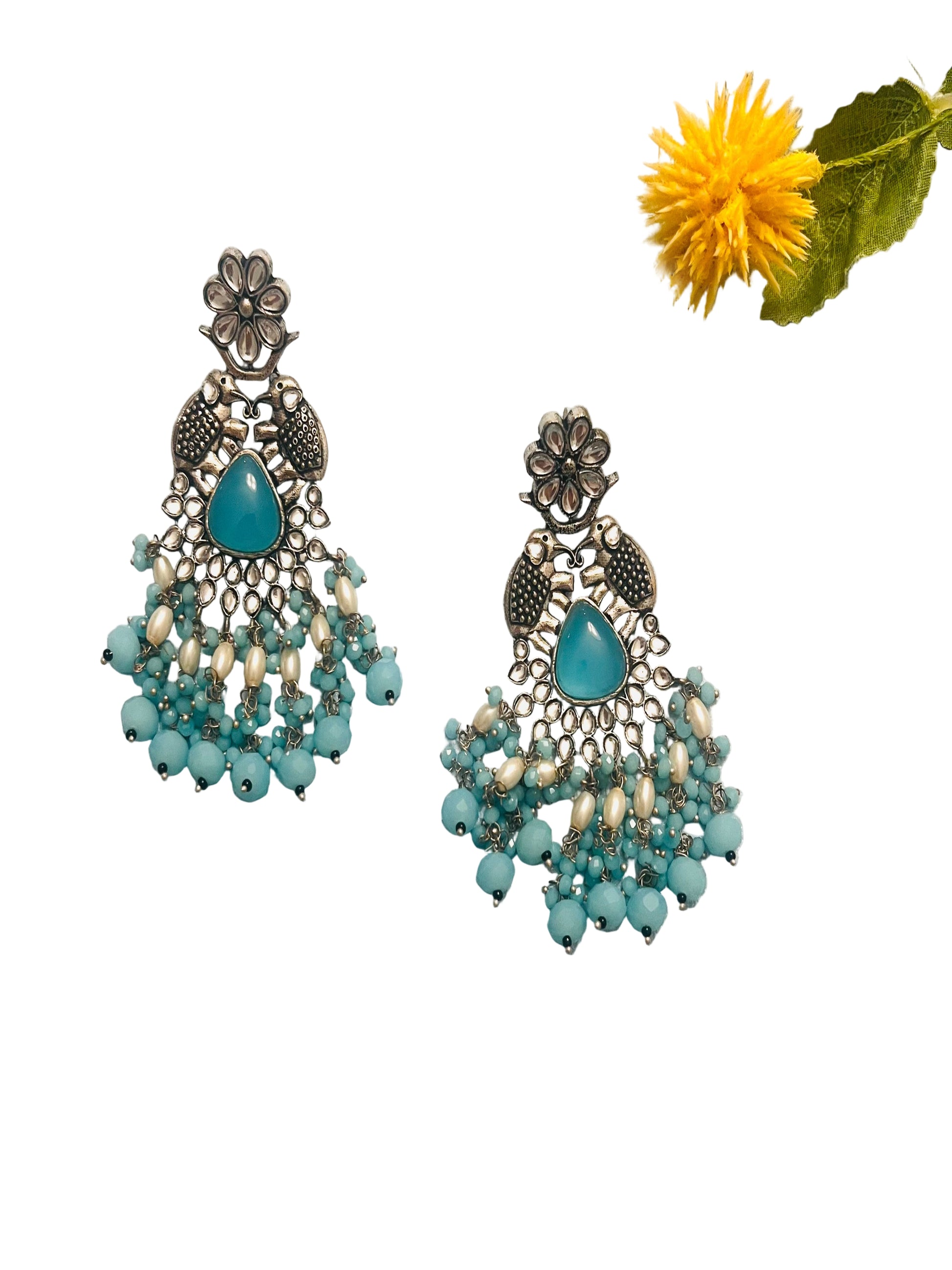 Indulge in luxury with our German Silver Earrings. Made with high-quality materials, these earrings feature delicate light blue stones and pearls, adding a touch of elegance to any outfit. The unique elephant design combines modern and traditional elements, making them ideal for special occasions.