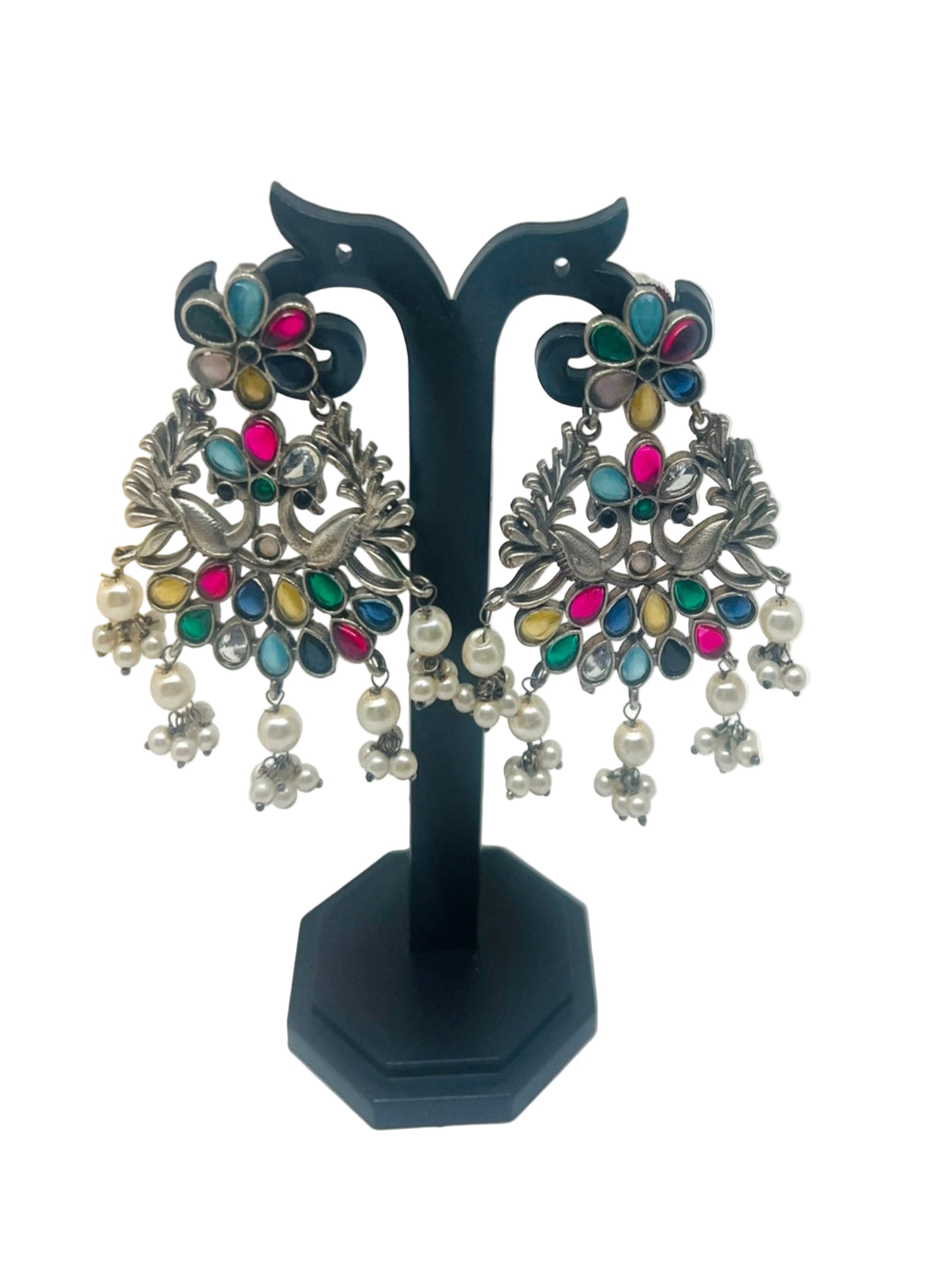 Elevate your look with our German Silver Earrings. These lightweight, eye-catching earrings are adorned with multi-color stones, creating a unique and elegant accessory. Perfect for any occasion, these earrings will become your go-to choice for adding a touch of sophistication to your outfit.