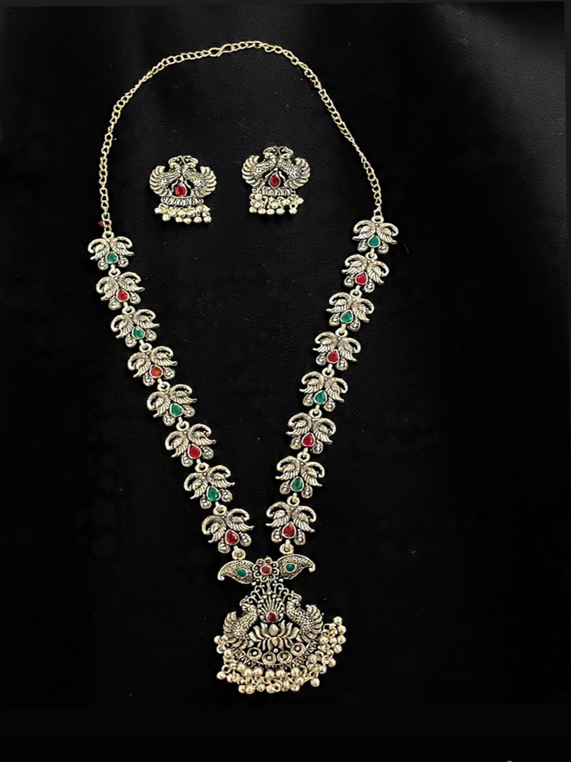 Crafted from lightweight German silver, this striking piece features rich maroon and green stones that command attention without weighing you down. The extended length offers versatile styling options, while the coordinating studs complete your sophisticated look. Perfect for layering or wearing solo, this set delivers timeless beauty with contemporary flair.