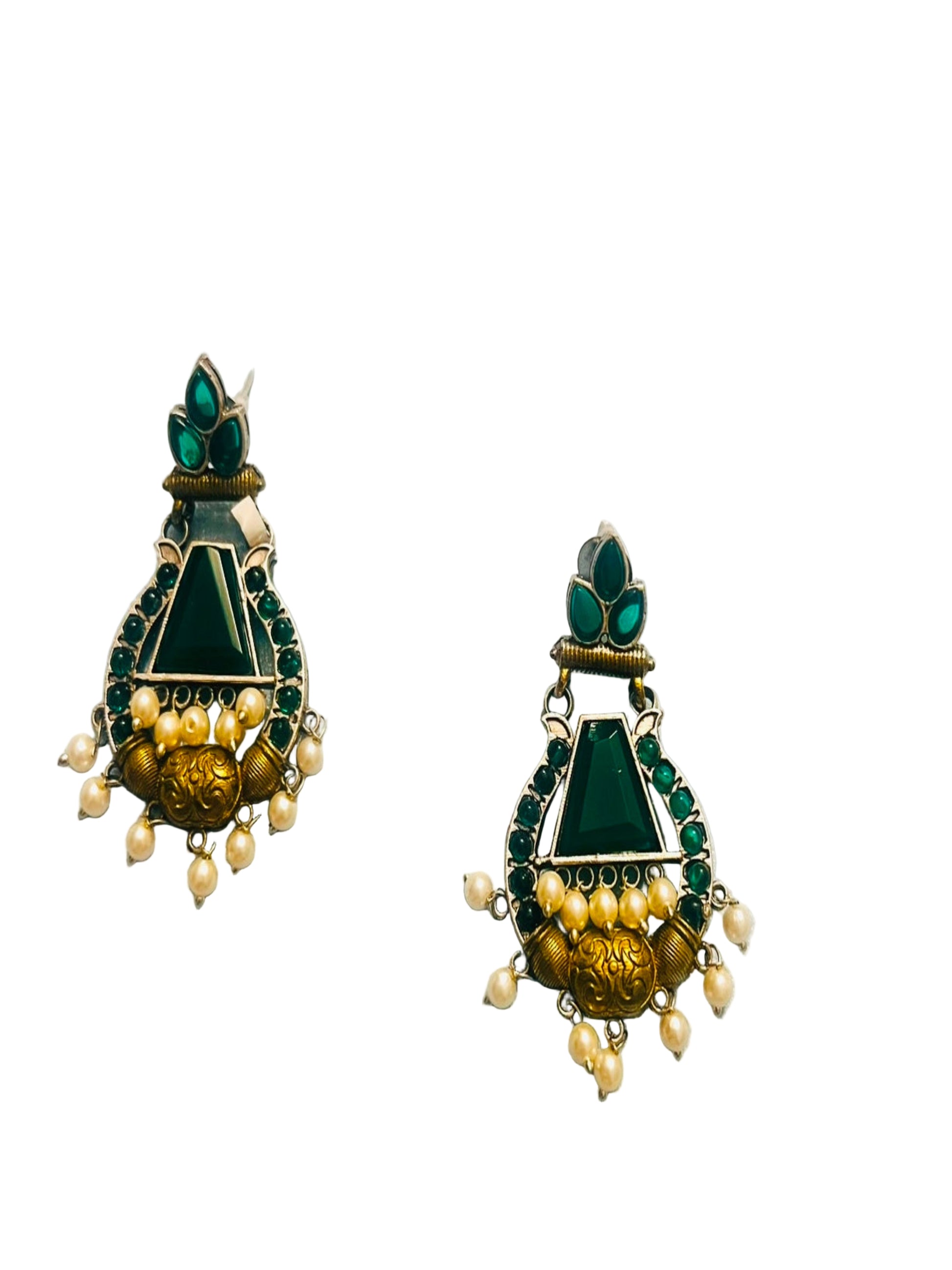 Elevate your style with our Green Stone Earrings, a luxurious touch of elegance. These stunning earrings boast a dual-tone finish, inspired by the radiant green of emerald stones, and adorned with lustrous white pearls. Their sophisticated design is sure to enhance any outfit.