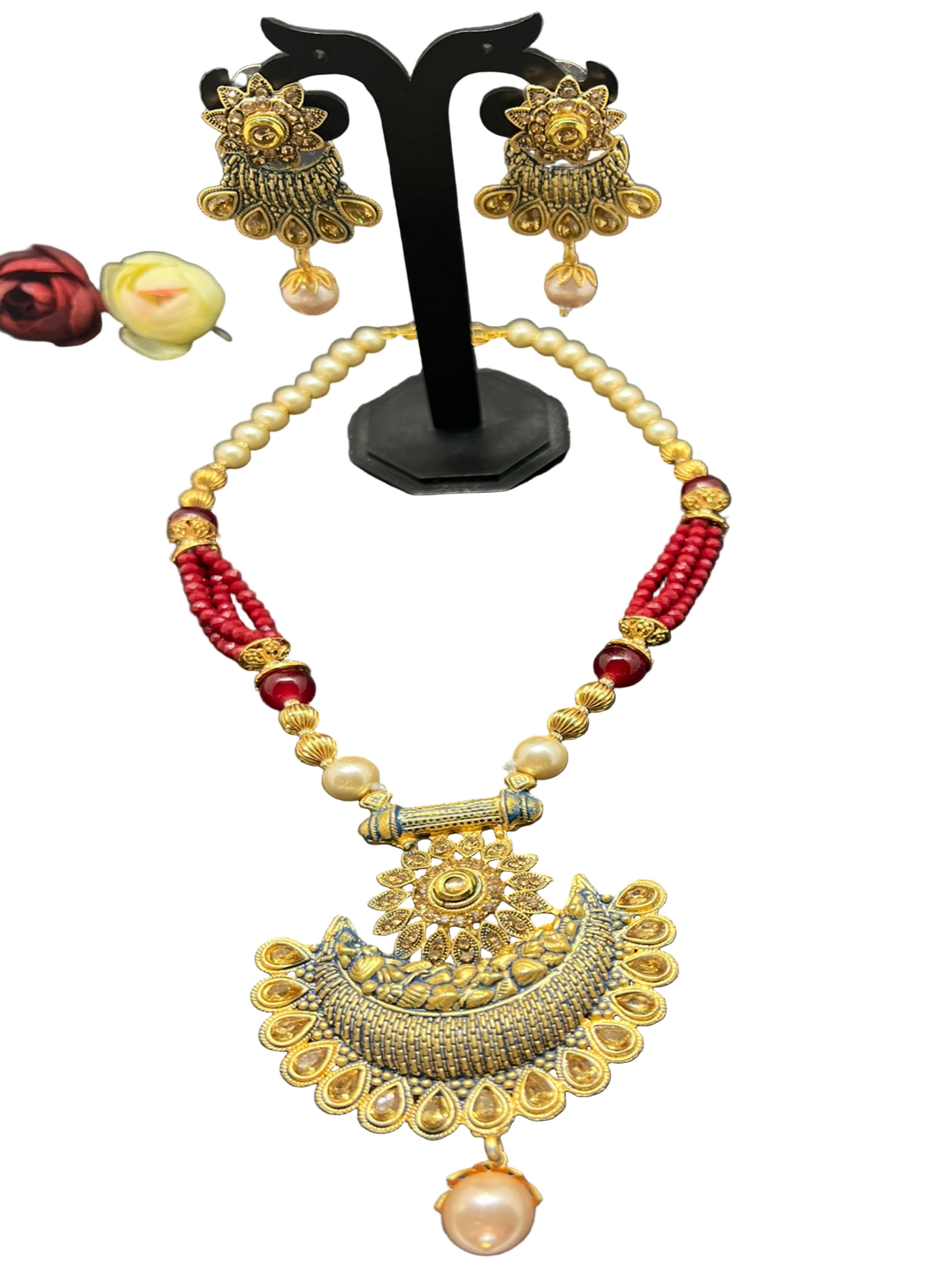 This elegant Meenakari necklace features a unique half moon theme, adorned with delicate red crystals for a touch of elegance. Perfect for festive occasions, this necklace is a must-have addition to your jewelry collection.
