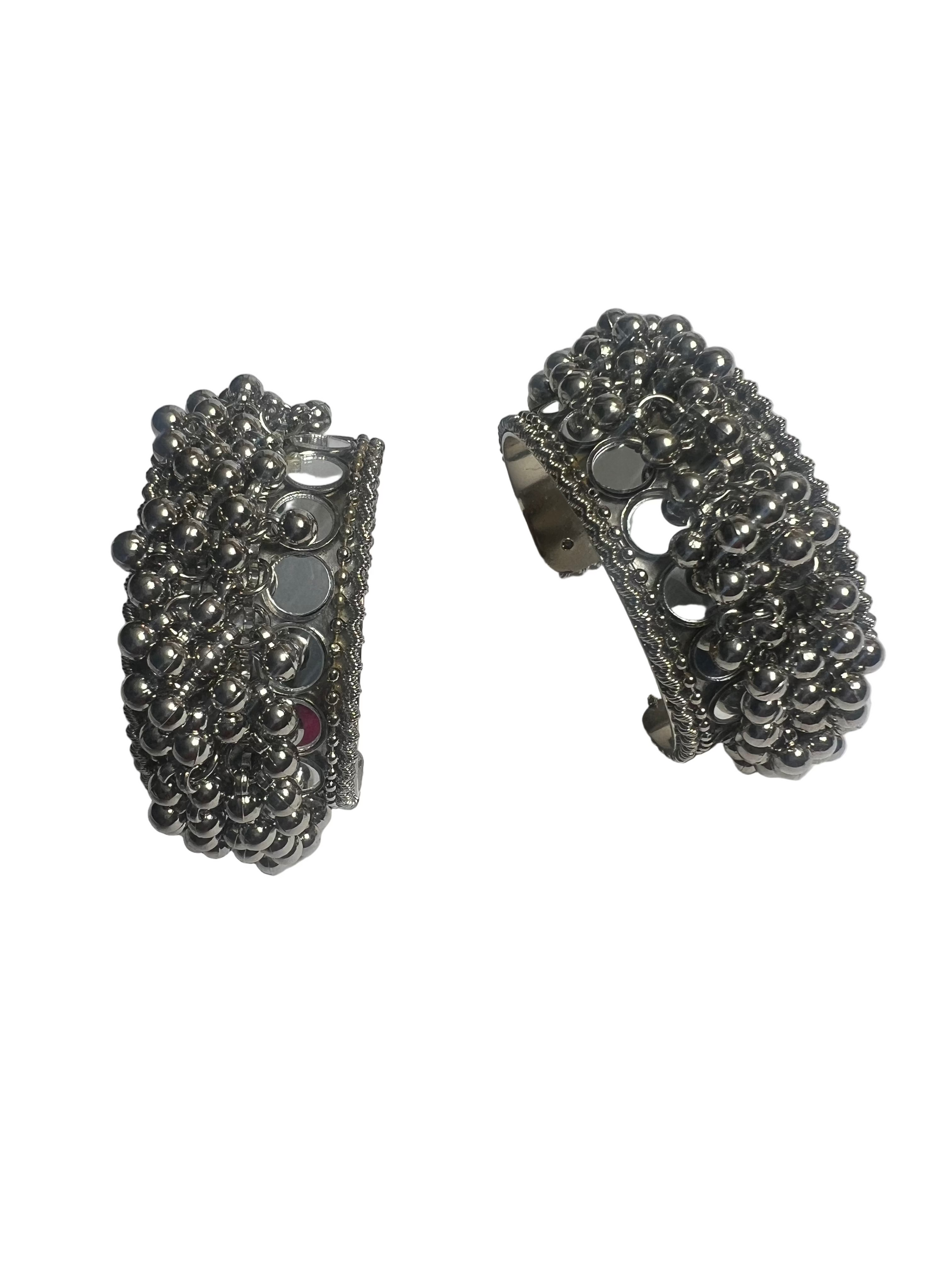 Elevate your festive look with these exquisite open bracelets featuring delicate mirrorwork and charming ghungroo accents. Lightweight and artfully crafted, they add a subtle yet striking shimmer to any ensemble, embodying a sophisticated festive spirit. Perfect for enhancing elegance with a touch of cultural grace.