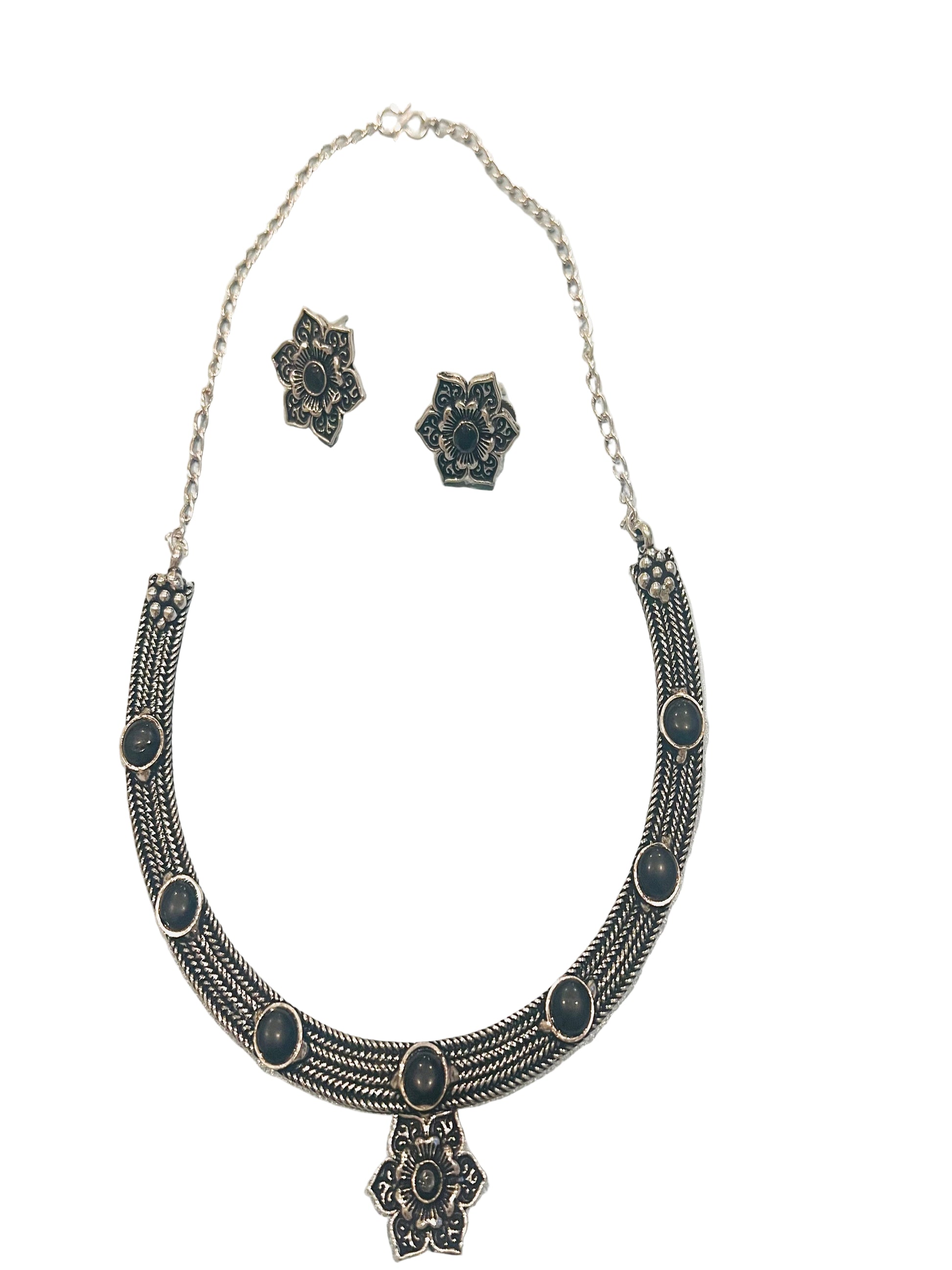 Elevate your style with our Oxidized Choker/Necklace Set. The intricate flower design and delicate studs make this choker unique. Lightweight and effortless, it will add a touch of sophistication to any outfit.