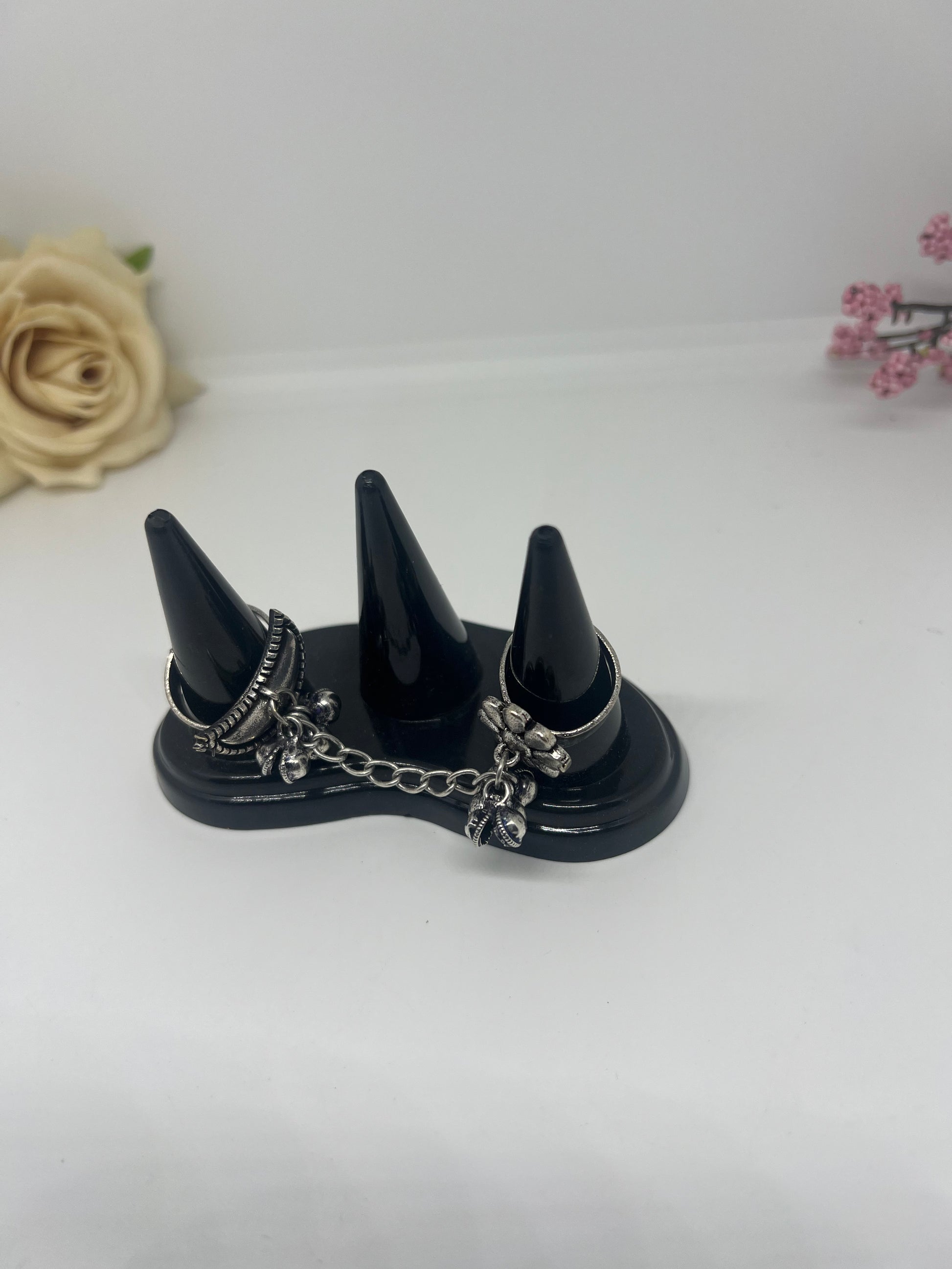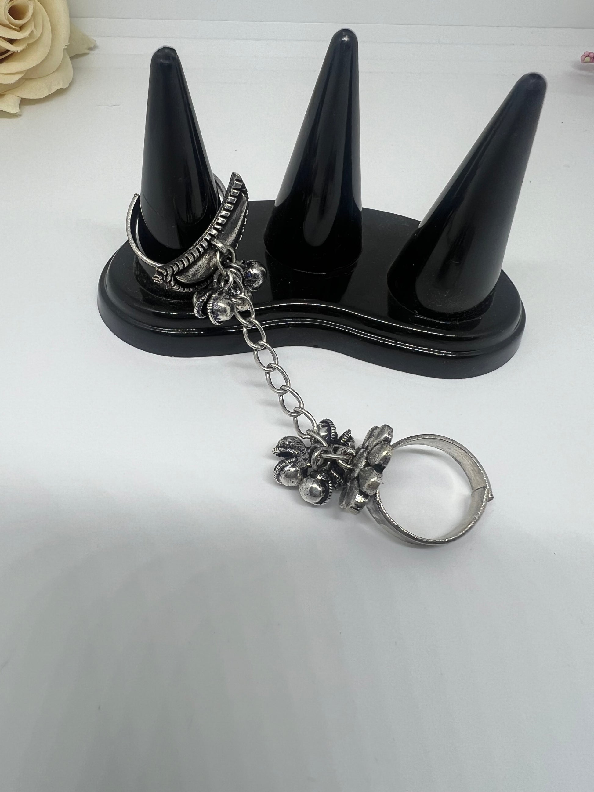 This oxidized dual chain adjustable ring artfully embraces two fingers, combining unique design with elegant craftsmanship. Its sophisticated, contemporary style adds a subtle edge to any look, making it an exceptional accessory for those who seek distinctive yet refined jewelry.