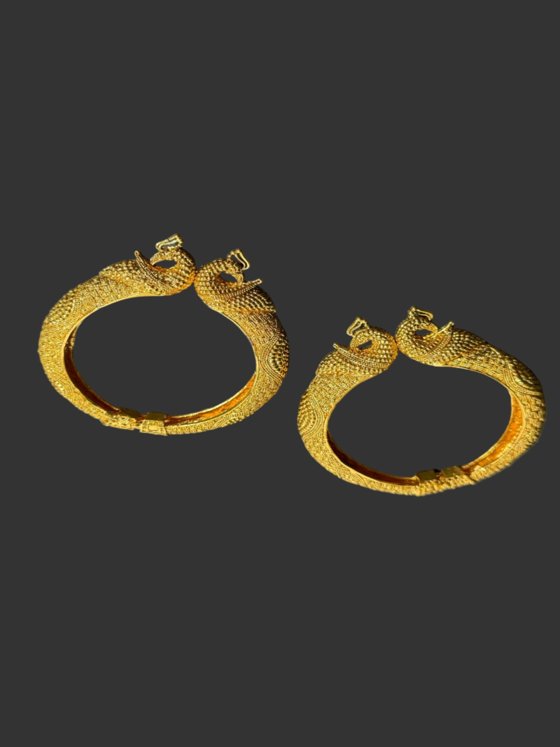Elevate your festive ensemble with these exquisite Peacock Theme gold-plated openable kadas. Crafted with meticulous attention to detail, the intricate peacock design captures timeless elegance and cultural sophistication. The openable mechanism ensures effortless wear and removal, while the lustrous gold plating adds a refined shimmer to your wrist. Ideal for weddings, celebrations, and special occasions, these kadas seamlessly blend traditional artistry with contemporary style.
