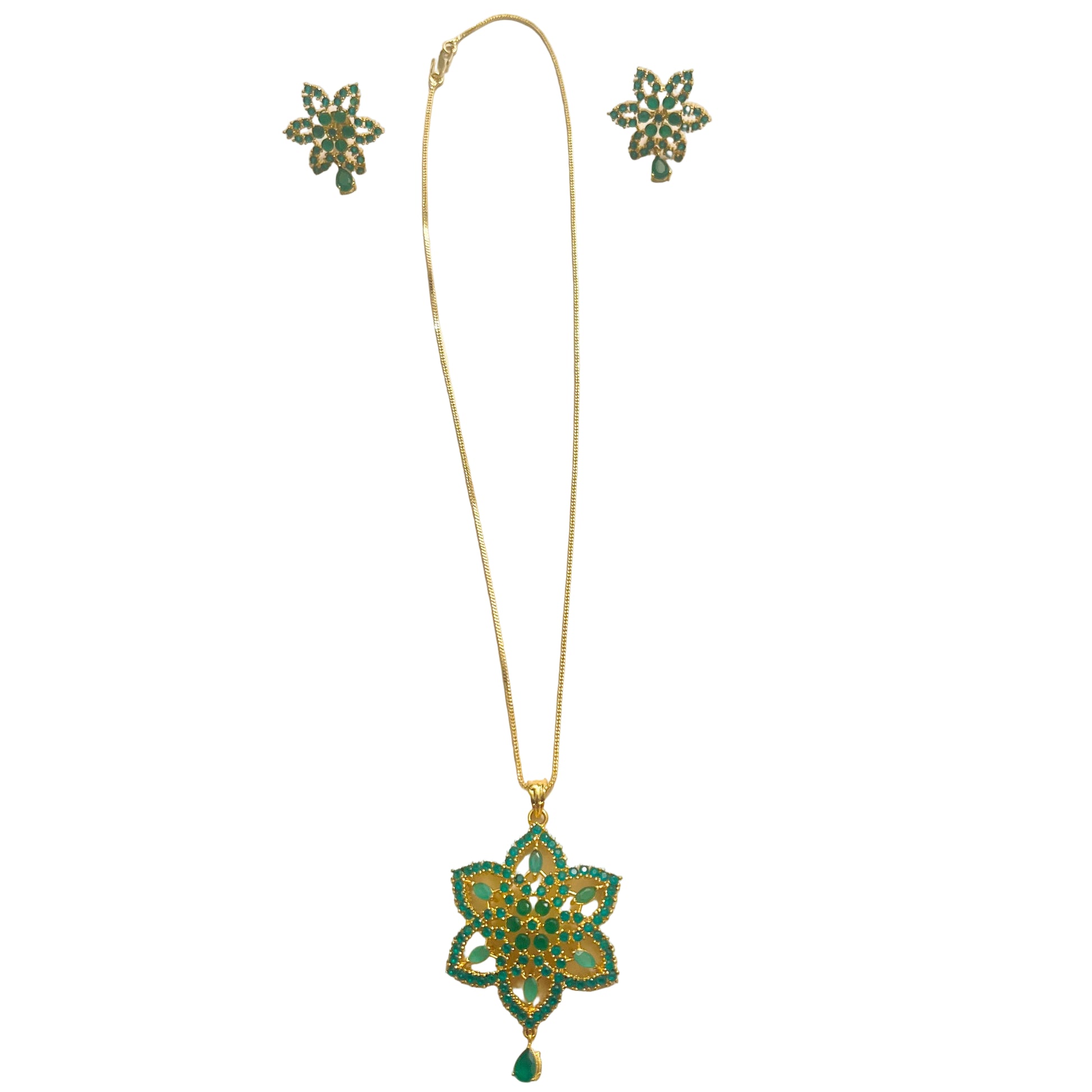 Get ready to make a statement with our Pendant Set! This elegant and lightweight set features a stunning green stone, perfect for adding a touch of sophistication to any outfit. Versatile and classy, this set can easily be paired with any outfit for a polished look.