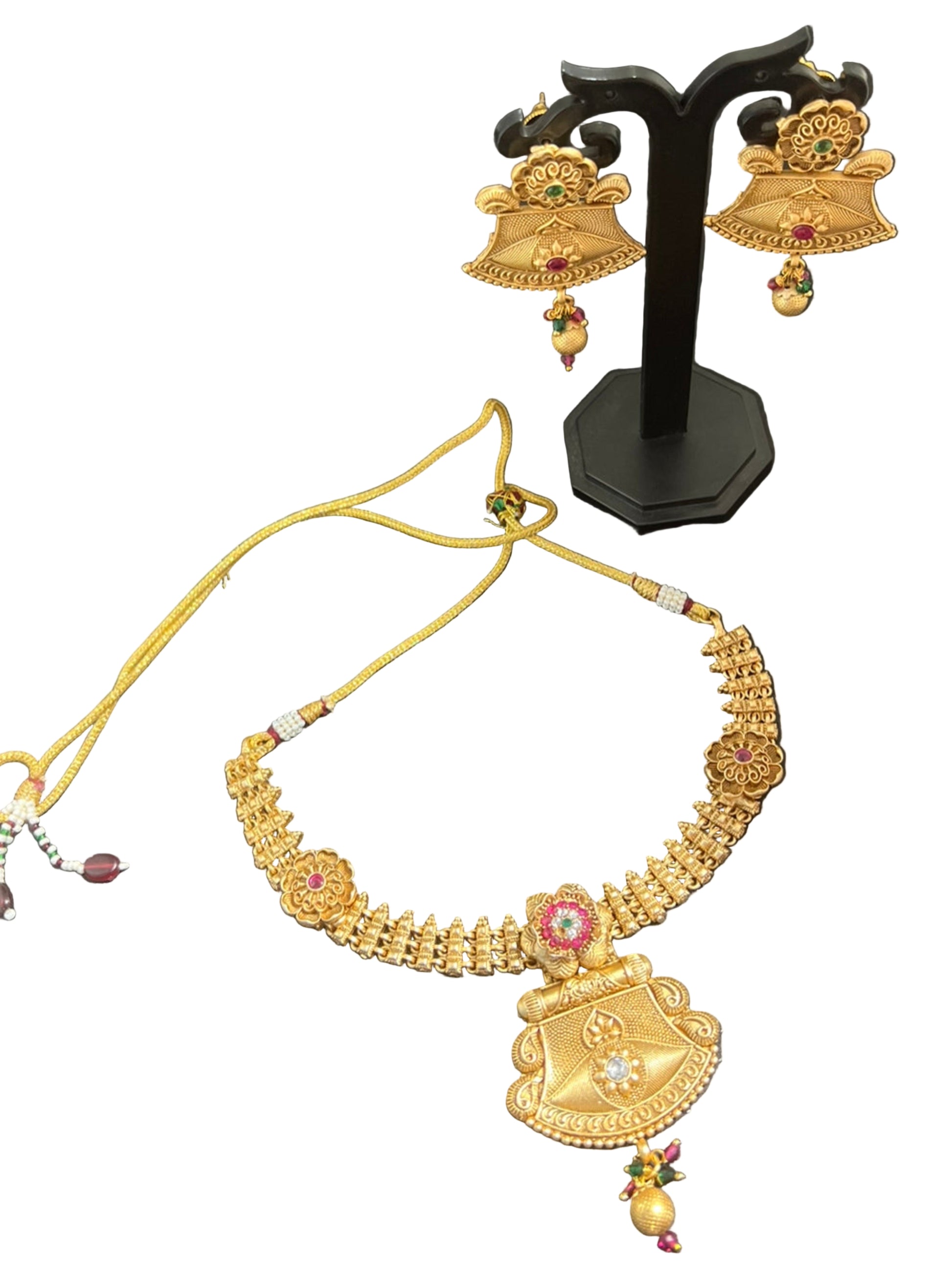 Get ready to shine with the Rajwadi Necklace with Earrings. Featuring a traditional Rajwadi polish and hasdi style, this set is perfect for any festive occasion. The stunning pink and green stones add a touch of elegance and will make you stand out in any crowd.