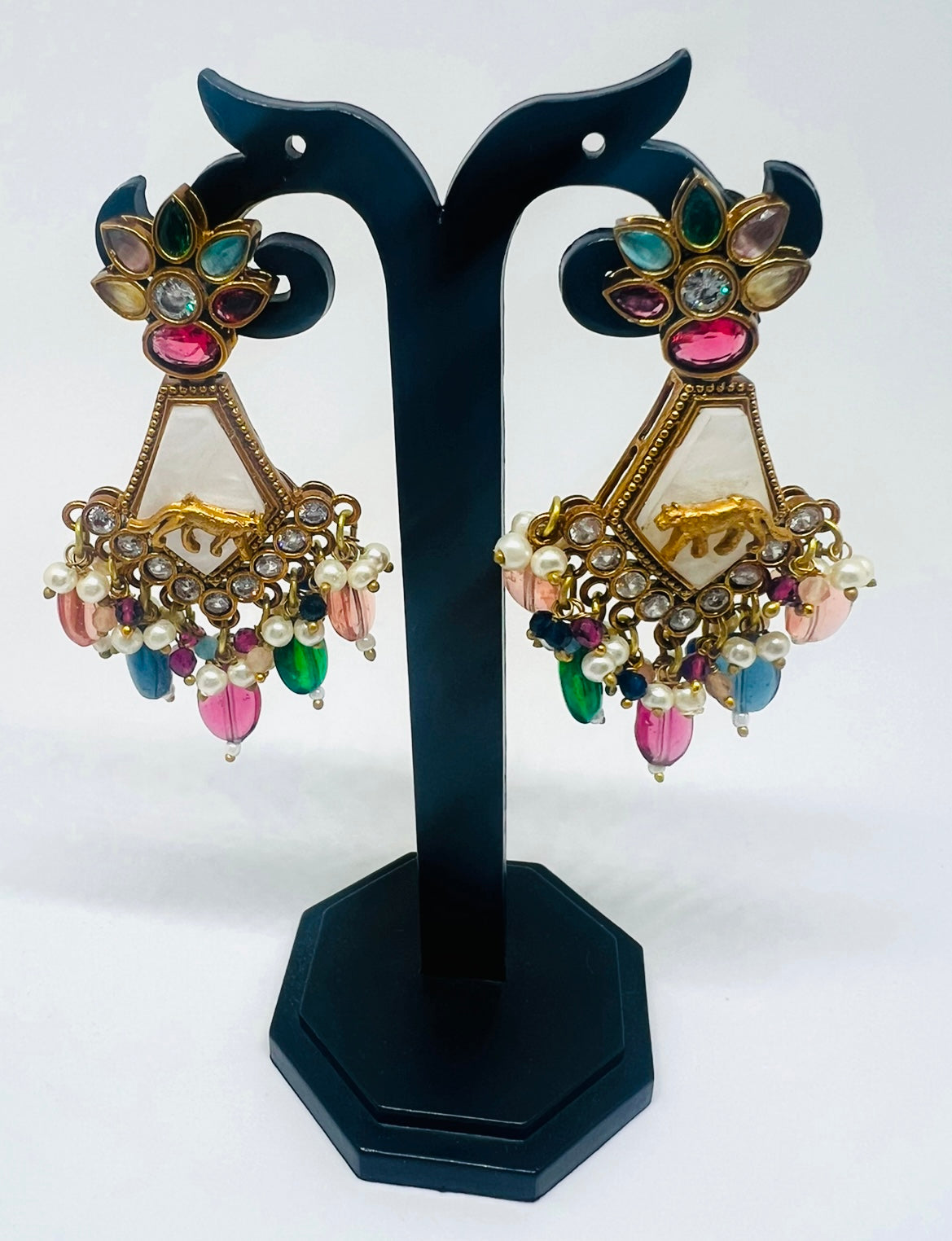 Elevate your festive look with this Sabyasachi inspired choker necklace, featuring intricate stone work and vibrant multi-color beads. The regal tiger motif adds a distinctive touch of royalty, making it perfect for any celebratory occasion. Designed to complement traditional attire, this choker blends sophistication with timeless elegance.
