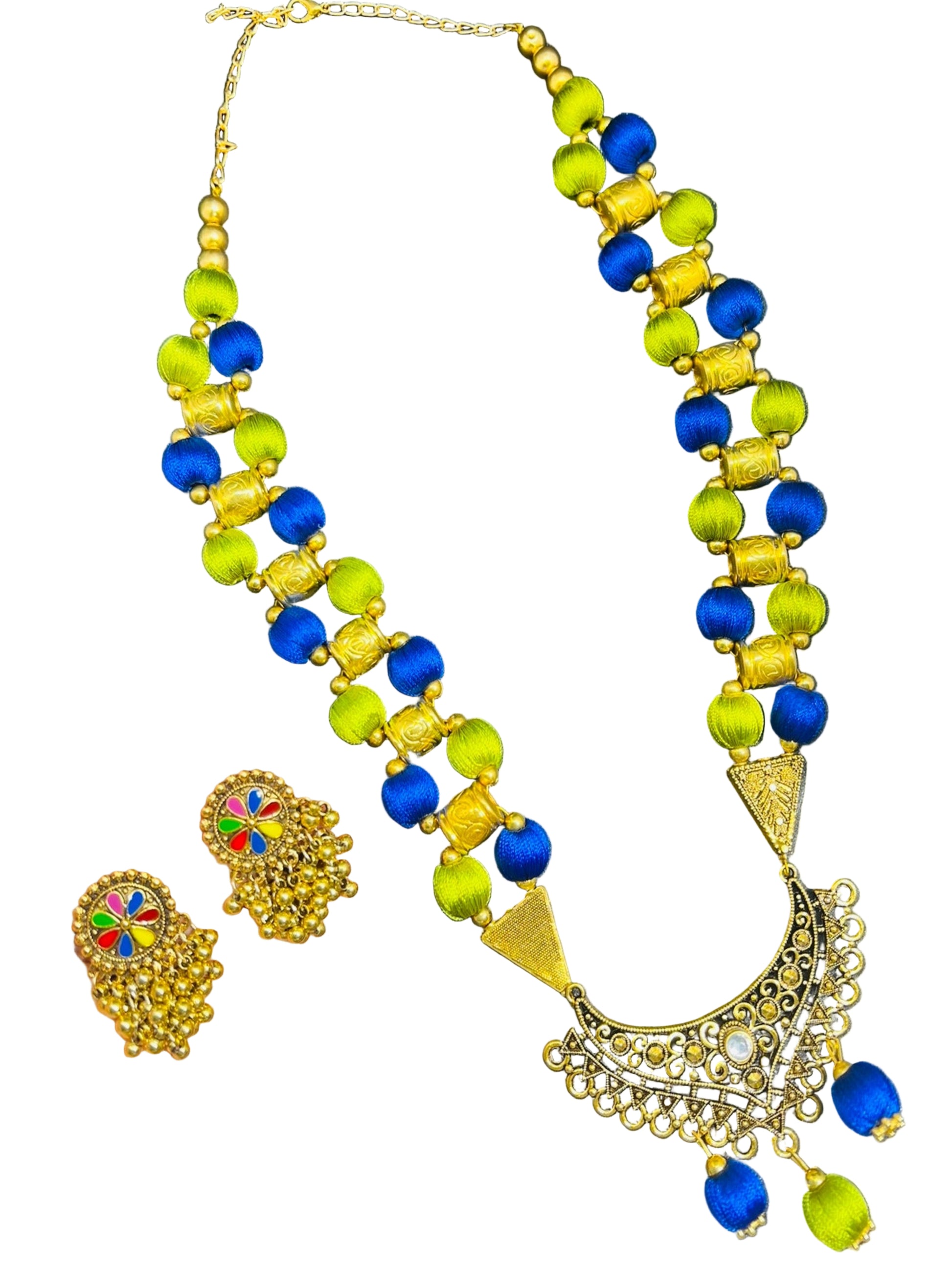 This long necklace features a stunning antique and threadwork design that incorporates shades of blue and green. The matching earrings add a touch of elegance with their delicate ghungroo accents.