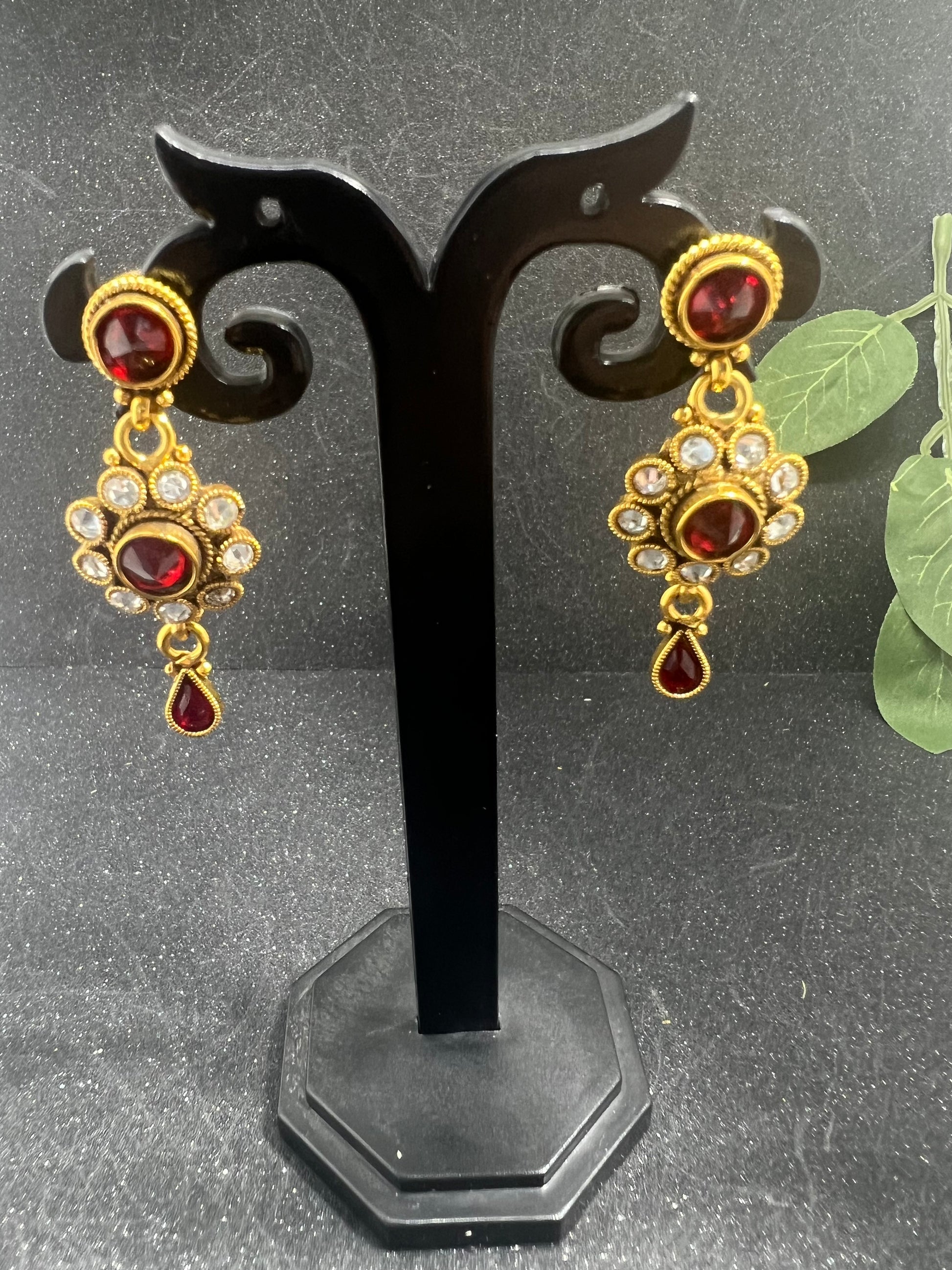 Elevate your jewelry collection with our Uncut Diamond Choker Necklace and Earrings. The gold plating and maroon stones exude luxury, while the natural uncut diamonds add a touch of uniqueness.